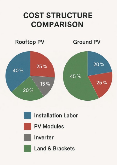 Bu iki sistemi karşılaştırırken maliyet önemli bir faktördür. Çatı PV sistemleri, mevcut bina yapılarını kullandıkları için genellikle arazi kullanımı açısından daha düşük maliyetlere sahiptir. Ancak çatıların düzensiz şekilleri olması veya takviye gerektirmesi durumunda kurulumun karmaşıklığı masrafları artırabilir. Zemin PV sistemleri genellikle arazi hazırlığı, temel inşaatı ve destekleyici yapılar nedeniyle daha yüksek başlangıç maliyetlerine sahiptir. Bununla birlikte, yer sistemleri çoğu zaman ölçek ekonomisine olanak tanır ve bu da onları büyük projeler için uygun maliyetli hale getirir. Genel yatırım kararı mevcut arazi kaynaklarına, beklenen enerji çıkışına ve uzun vadeli yatırım getirisine bağlıdır.
